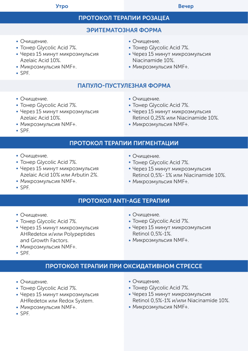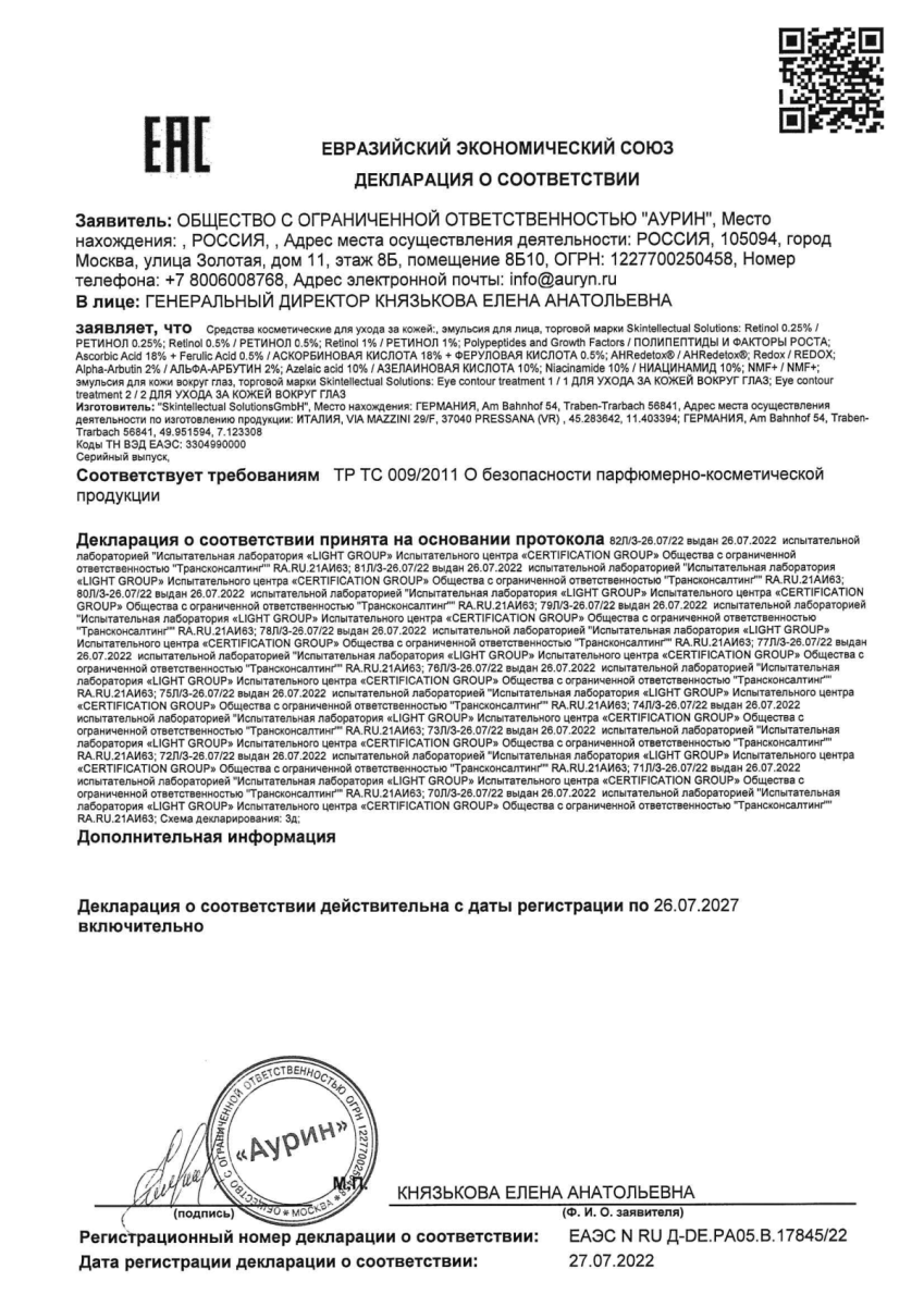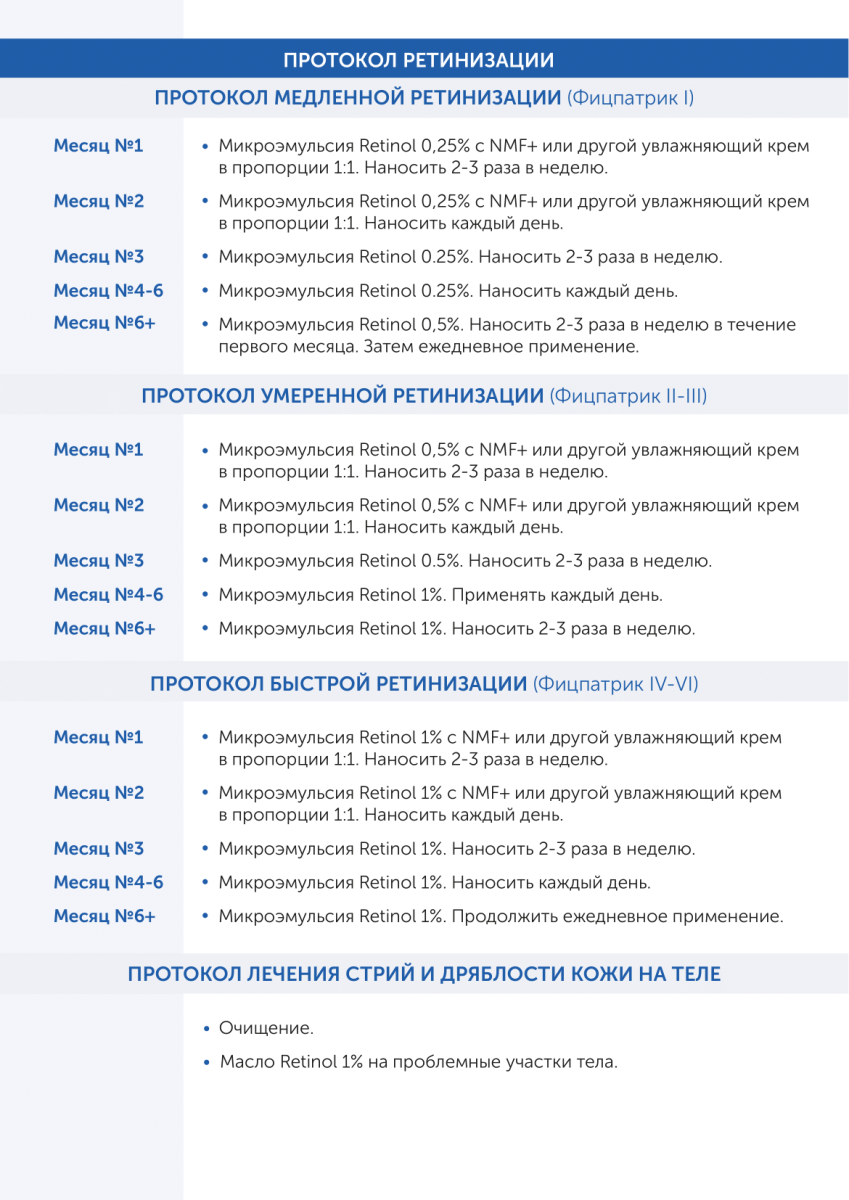 выравнивает тон и текстуру кожи,а разное процентное содержание ретинола (от 0,25% до 1%) в микроэмульсии позволяет минимизировать риск нежелательных реакций. Требуется консультация дерматокосметолога.